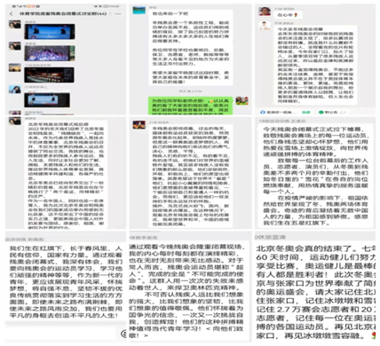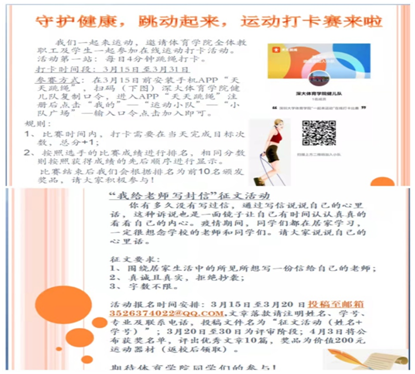 3月13日,体育学院辅导员组织了全体留校学生在线观看了2022冬残奥会闭幕式。同学们在讨论区就精彩的比赛展开讨论,并分享了作为新时代大学生的心得体会。同学们积极发言,为中国体育的腾飞而激动,为祖国的强大而自豪!相信我们的祖国一定能带领我们战胜疫情。另外,我院面向全院学生开展了“我给老师写封信”征文活动,以及云建身线上运动打卡活动,发布后获得了同学们的积极响应。
