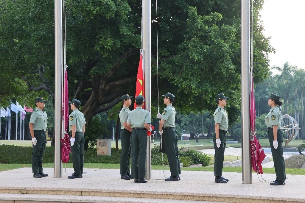 上午7点15分,主持人宣布升旗仪式正式开始。五星红旗随着庄严的《义勇军进行曲》旋律冉冉升起,全体师生肃立,向国旗行注目礼,深怀对祖国的无限热爱和崇高敬意。随后,军乐团奏响《歌唱祖国》,国旗护卫队升校旗。