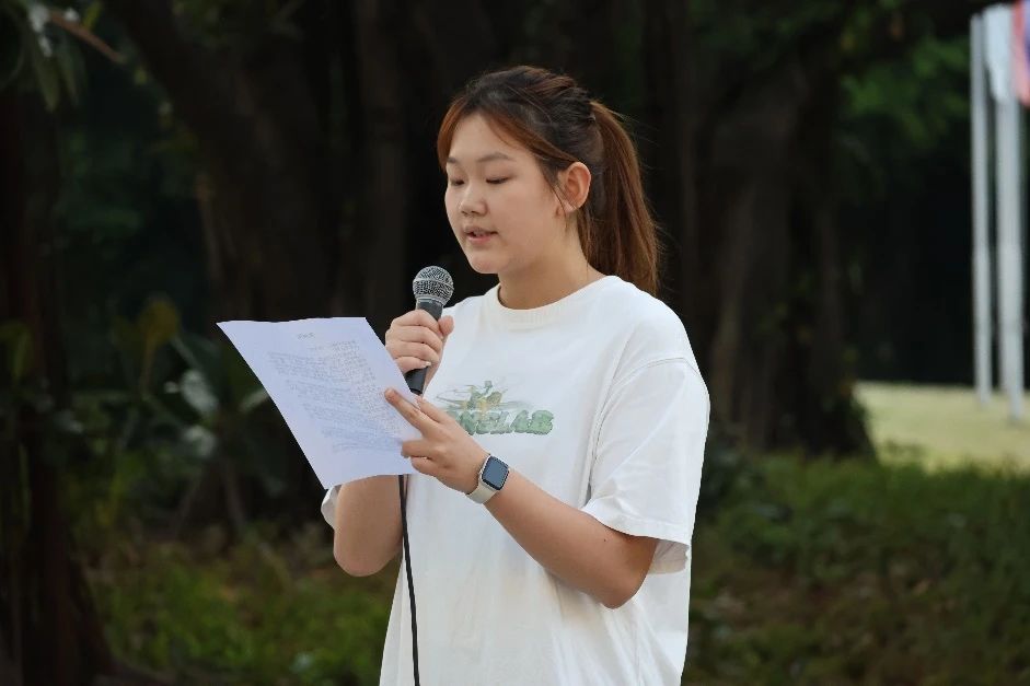 学生代表霍妙凡同学上台发言,通过列举生活中的各项细节讲述如何做到勤俭节约。霍妙凡同学倡导同学们选择步行或骑自行车代替打车,选择自带餐具减少一次性餐具的使用,将废旧物品进行回收再利用。通过生活中微不足道的小事,可以在无形中培养我们的节约意识,让我们成为勤俭美德的传承者和实践者。”