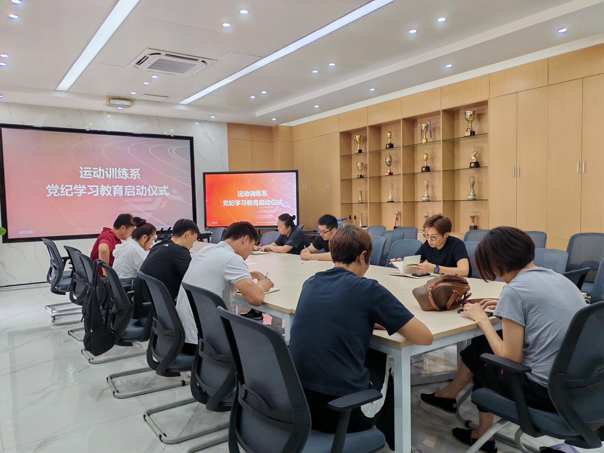 2024年5月20日中午,体育学院运动训练系党支部在元平体育馆会议室召开了“党纪学习教育专题会议”,开展了党纪学习教育启动仪式。会议共进行了四项议题,一是集中统一学习了习近平总书记《必须坚持人民至上》重要系列文章;二是统一学习了《中华人民共和国保守国家秘密法》;三是统一学习了《全面深化改革开放,为中国式现代化持续注入强劲动力》重要文章;四是理解和把握了《中国共产党纪律处分条例》总体框架,确定学习方式,灵活采取集中学习、自主学习、支部共建、警示教育等方式进行理解和消化。