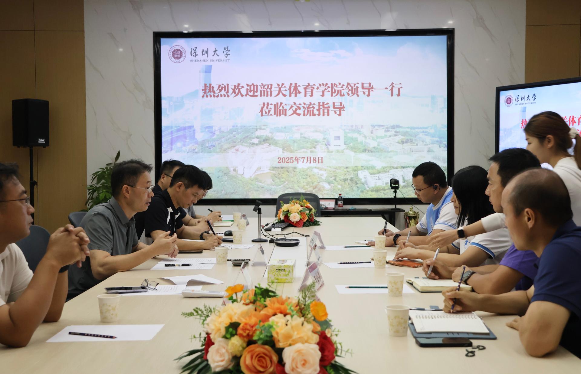 为贯彻党的教育方针,借鉴办学经验,推动内涵式发展,提升本科教学质量,2025年7月8日,韶关学院体育学院副院长艾安丽、王全军率系主任团队赴深圳大学体育学院调研交流。本次调研聚焦专业建设、教学改革、人才培养与基层治理等核心问题,旨在深化交流互鉴,共谋体育教育高质量发展。深圳大学体育学院副院长张得保、王东、唐玉成,学院党政办主任吴杰清、体育教育系主任赵刚、休闲体育系副主任尹利军等参加了座谈交流。