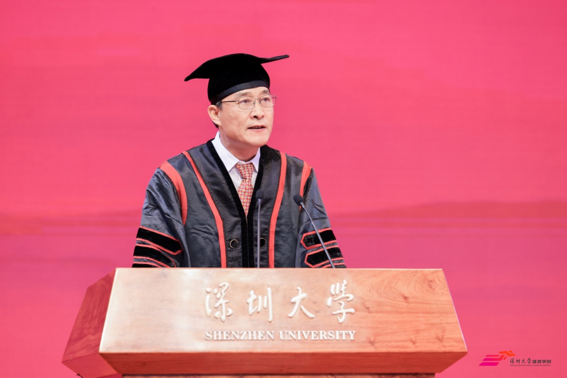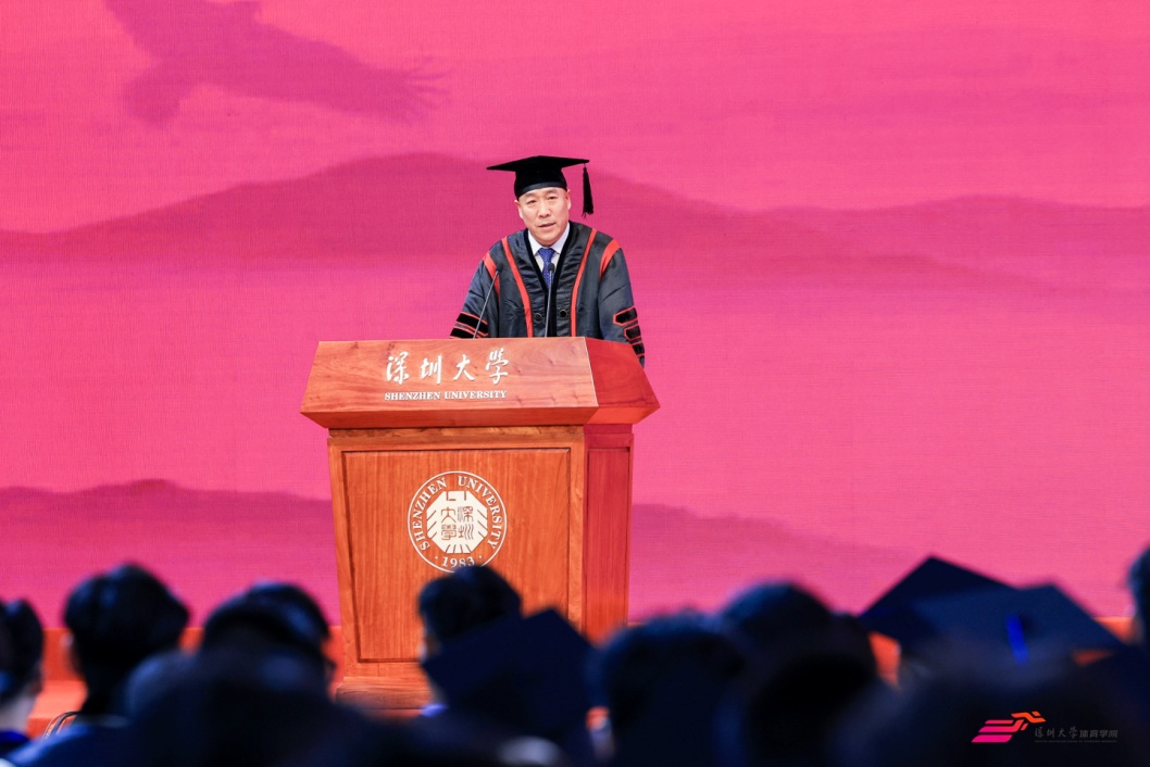 体育学院院长刘建致辞,他代表学院向2025届全体毕业生致以热烈祝贺。院长以长辈身份分享人生感悟,一是身份转变,今日是人生关键分水岭,毕业生将迎来社会角色转变,需承担新责任、塑造新自我;二是“三自精神”,面对未来挑战,要做到"自立"(独立解决问题)、"自律"(坚守底线)、"自强"(持续提升能力),践行深大校训内核;三是长远发展,无论职业选择如何,需兼具梦想与实干,保持情怀与担当。最后,院长以"此去星辰大海,一路繁花似锦"祝福毕业生,并强调"唯有真正自强,才能让父母安心"。