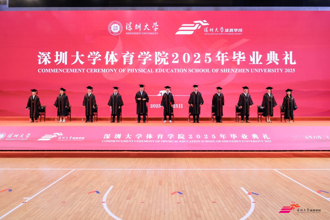 6月25日上午,深圳大学体育学院2025年毕业典礼暨学位授予仪式在元平体育馆隆重举行。体育学院党委书记李智军、院长刘建、副院长张得保、副书记陈方明、副院长王东、副院长唐玉成等领导、主礼教授、各系师生代表、毕业班班主任、全体辅导员,2025届毕业生及亲属400余人参加典礼,共同见证这一重要时刻。典礼由唐玉成副院长主持。