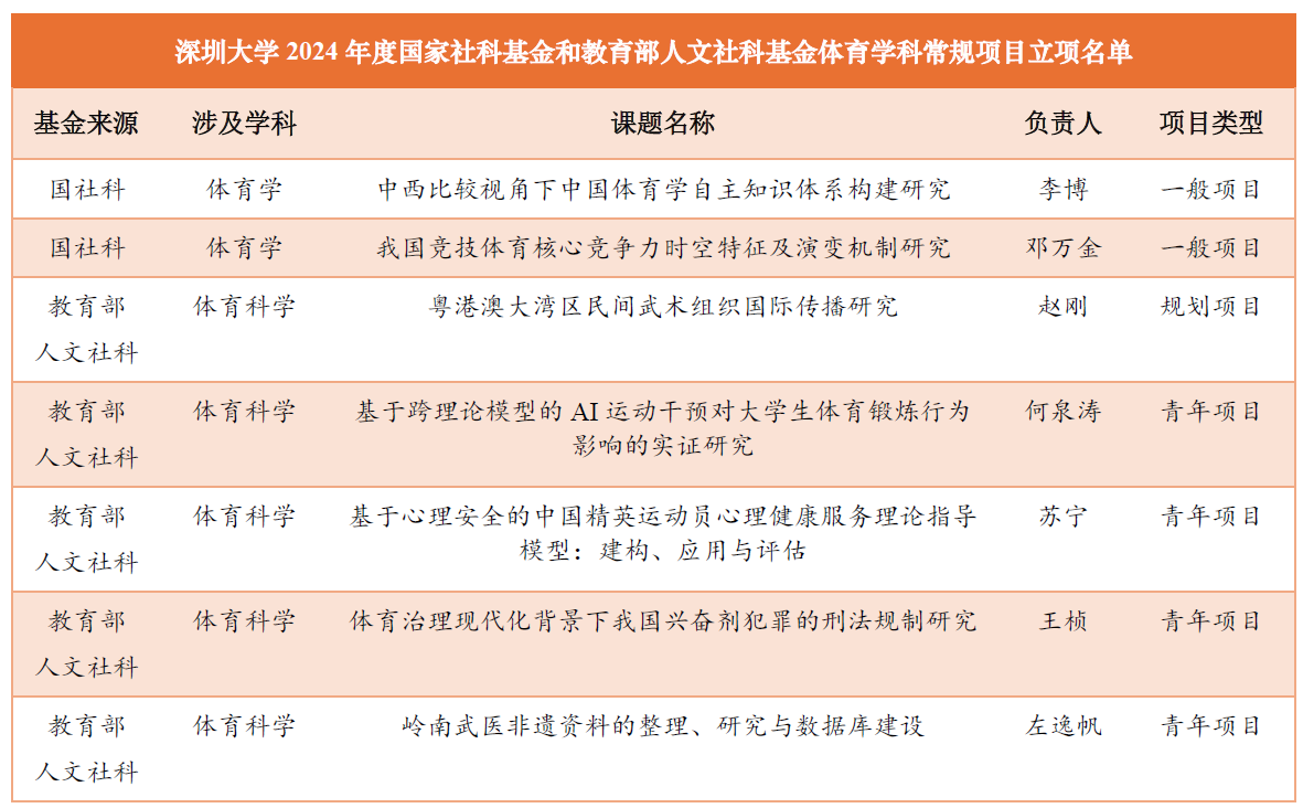 近日,我国教育部社科司和全国哲学社会科学工作办公室相继发布了《教育部社科司关于2024年度教育部人文社会科学研究一般项目立项的通知》以及《关于2024年国家社会科学基金年度项目立项名单的公示》。深圳大学体育学院在这两项基金申报上取得了历史性突破!教育部人文社科基金体育科学共拟立138项,深圳大学体育学院5项入选。国家社科基金重点、一般和青年项目体育学共拟立162项,深圳大学体育学院2项入选。
