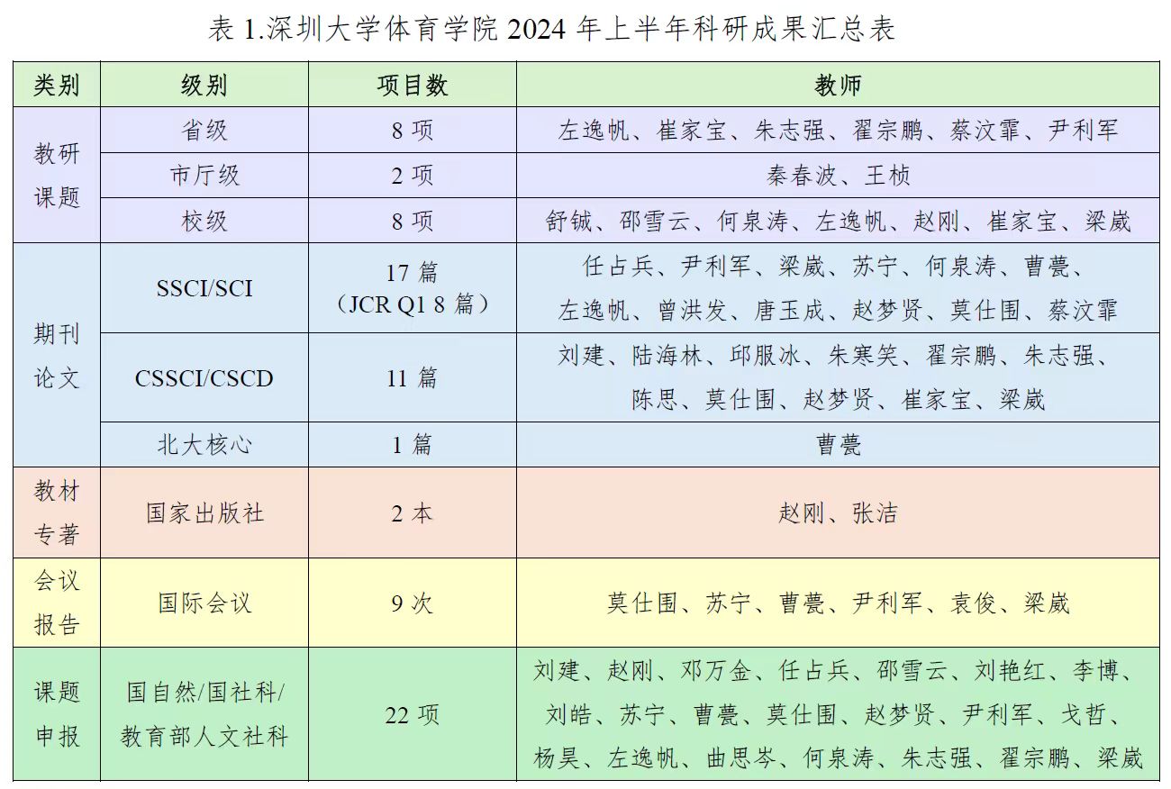 深圳大学体育学院在学校领导的关心和支持下,全体教育科研人员紧跟教育前沿理念,踔厉奋发,勇猛精进,稳步开展教学科研工作,2023学年第二学期学院科研成果再创佳绩。