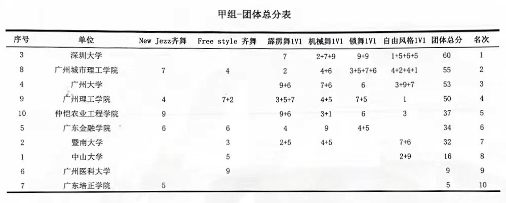 2023年6月6日-7日,延期举行的2022年广东省大学生街舞锦标赛在珠海市火热举行。本次比赛由广东省教育厅指导,广东省学生体育艺术联合会主办,暨南大学承办,广东省学生体育艺术联合会街舞分会协办。深圳大学街舞队共派出12名运动员参加了本次比赛。经过激烈争夺,斩获个人3金4银6铜的佳绩,荣获团体总冠军。