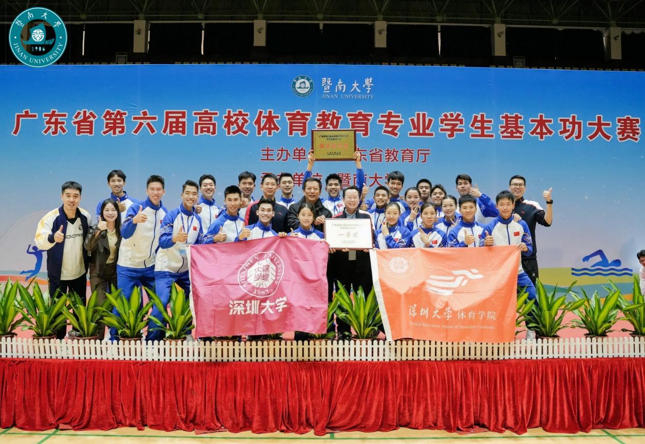 2023年11月18日至11月21日,广东省第六届高校体育教育专业学生基本功大赛在暨南大学顺利召开。深圳大学体育学院党委书记李智军、副院长张得保、副院长唐玉成,院教务管理办主任王晓东、篮球教研室主任张辉,协同8名教练员,带领20名深体健儿参加此次比赛。经过激烈的角逐,深圳大学代表队在15支参赛队伍,400名运动员中脱颖而出,首次获得团体一等奖和优秀组织奖。