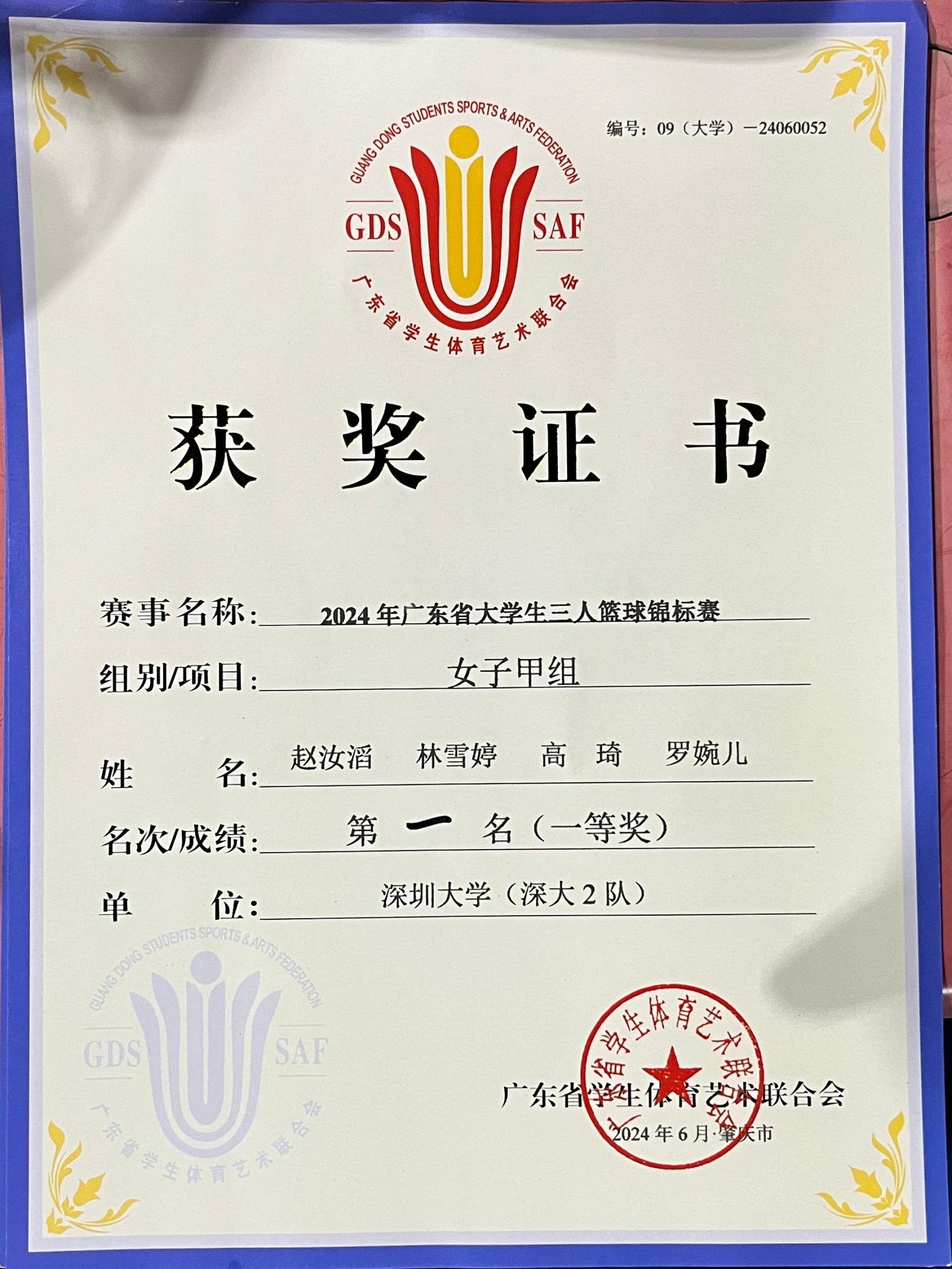 由广东省学生体育艺术联合会主办的2024广东省大学生三人篮球锦标赛于6月11-14日在肇庆市凤凰三立学校举行。我校女篮共派出三支队伍(12人)参加本次赛事。经过三天的艰苦奋战,深大二队(4人)从广东省女子甲组的55支队伍里脱颖而出,夺得冠军。李玢慧获得优秀教练员称号。