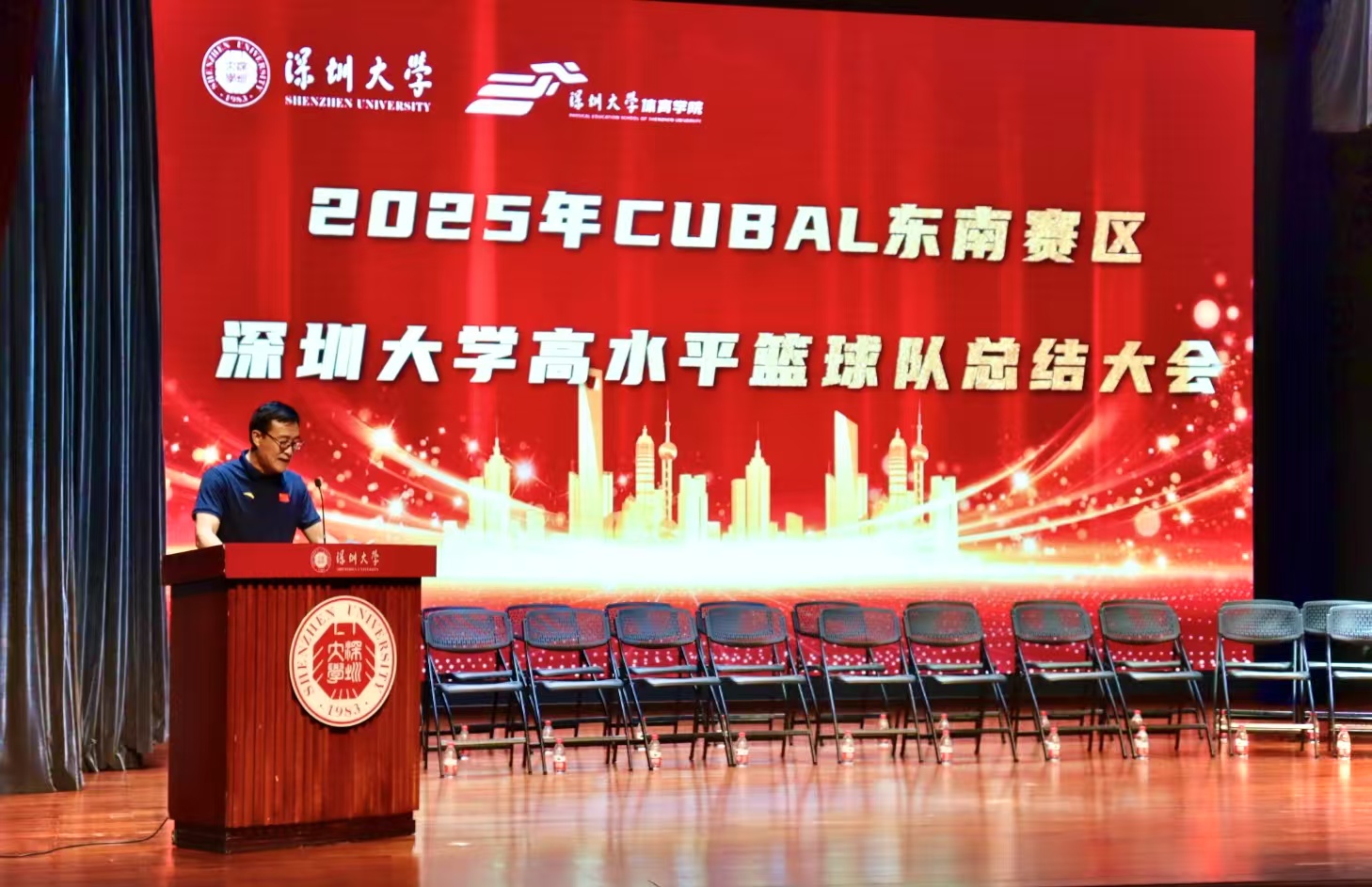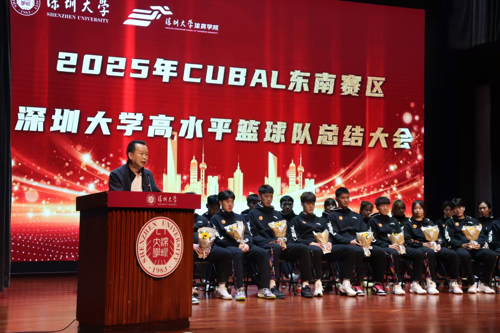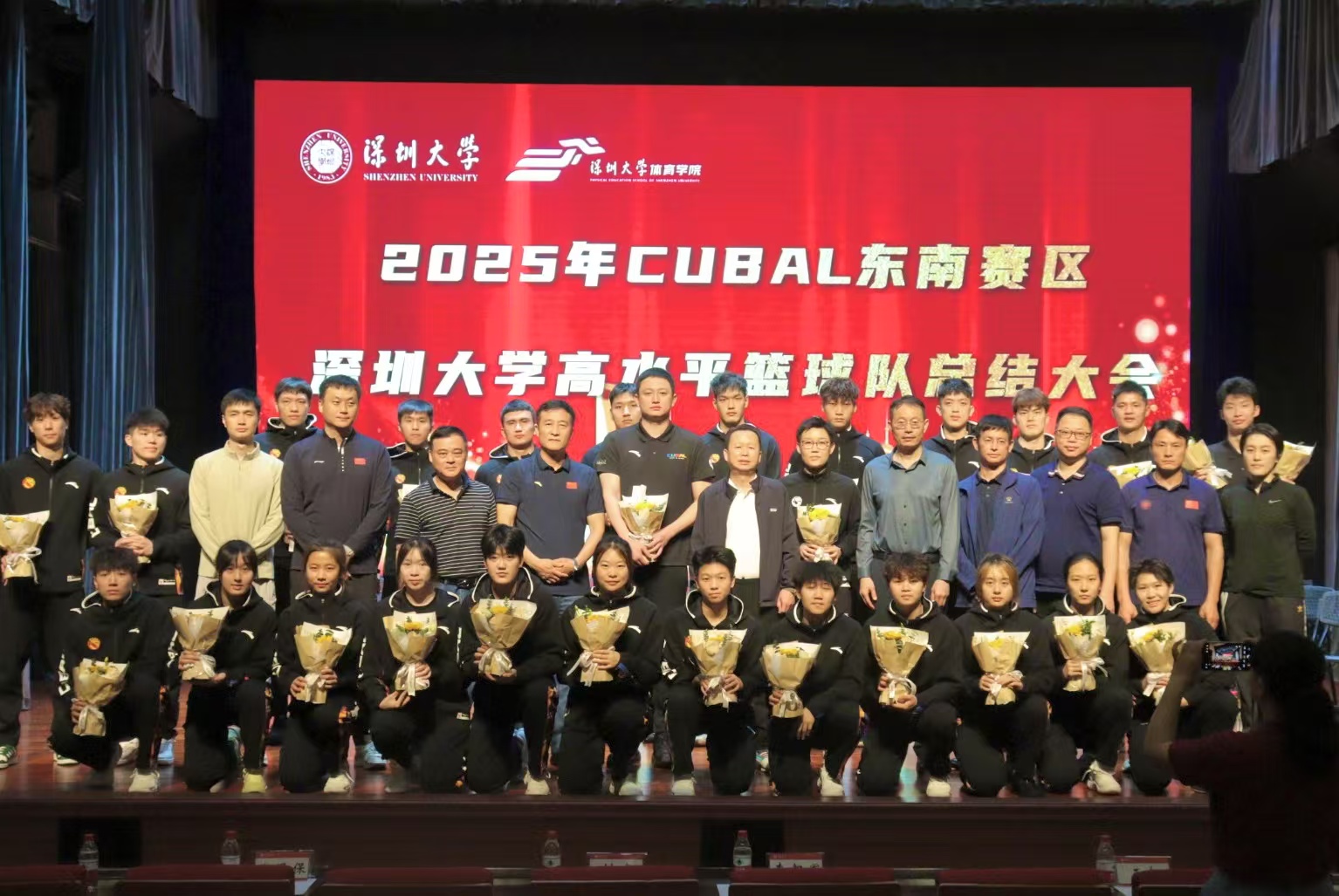 2025 年 3 月 14 日中午,体育学院于国际会议厅成功召开第 27 届中国大学生篮球一级联赛(东南赛区)高水平篮球队总结大会。此次大会由党委副书记陈方明主持,体育学院党委书记李智军、院长刘建、副院长张得保、副院长王东、副院长唐玉成以及 200 余名师生齐聚一堂,共同回溯深圳大学高水平篮球队在 CUBAL 东南赛区的高光历程。