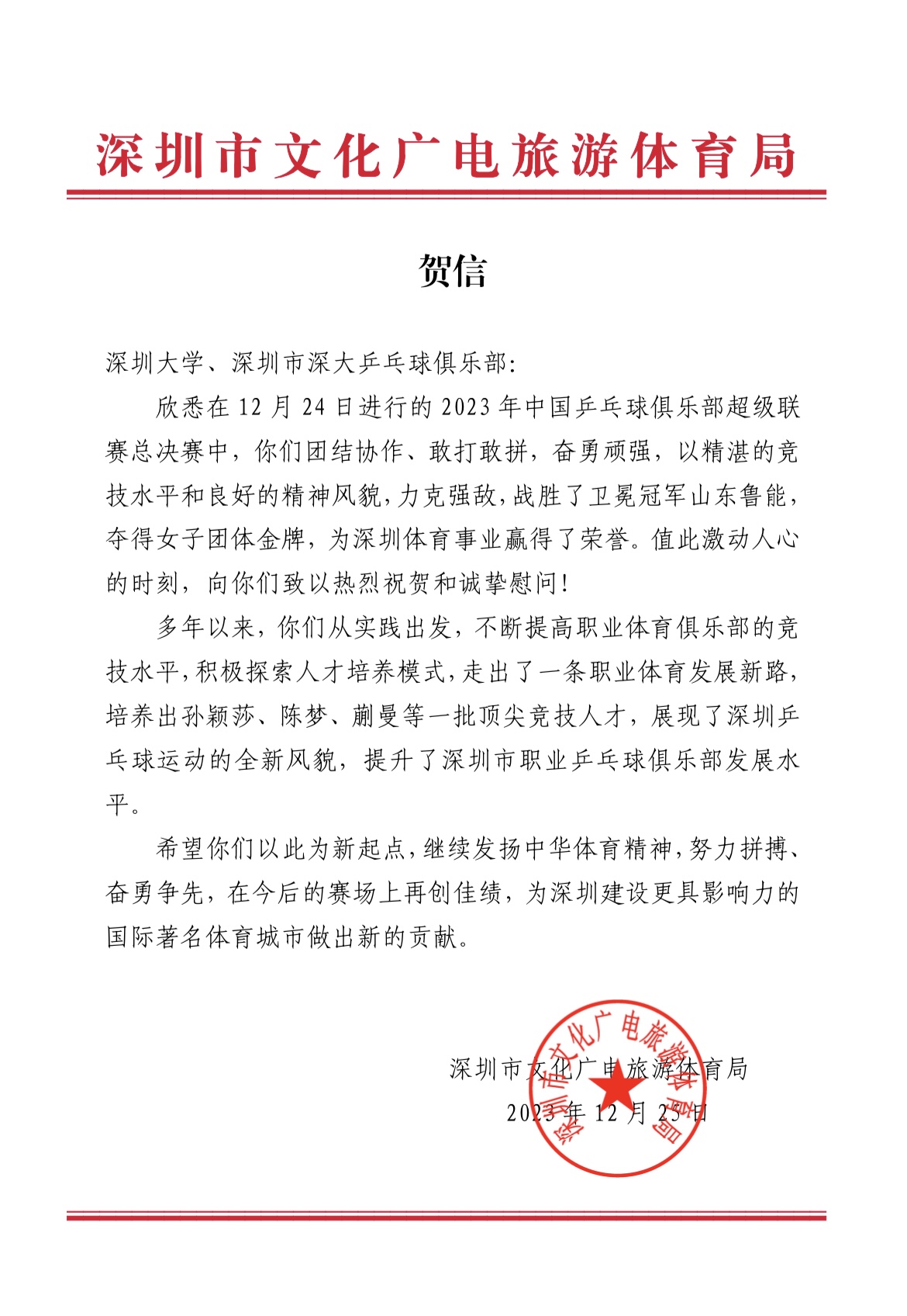 12月24日,2023年中国乒乓球俱乐部超级联赛总决赛,深圳市深大乒乓球俱乐部,以精湛的竞技水平和良好的精神风貌,力克强敌,战胜了卫冕冠军山东鲁能夺得女子团体金牌,为深圳体育事业赢得了荣誉。为此,12月25日,深圳市文化广电旅游体育局向深圳大学、深圳市深大乒乓球俱乐部发贺信。