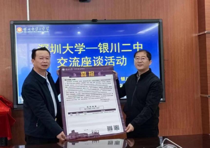 4月30日上午,宣讲组来到了银川二中。在与银川二中交流座谈活动中,李智军书记首先向学校赠送了二中学子“2023年深圳大学优秀学生”的获奖喜报,随后向学校介绍了深圳大学的基本情况,以及深圳大学的招生政策,解答了学校关于招生录取方面的疑问。陈少兵校长和苗阳教务主任在介绍银川二中时,详细阐述了学校的基础概况、坚守的办学理念以及丰富的历史沿革。陈校长谈到,银川二中始终致力于为学生提供全方位、高质量的教育服务。同时也表达了与深圳大学加强交流与合作的热切愿望。他们相信,通过与深圳大学的合作,共同探索新的教育方法和理念,为宁夏地区的教育事业发展注入新的活力。期待未来双方能够携手共进,为培养更多的优秀人才而共同努力。