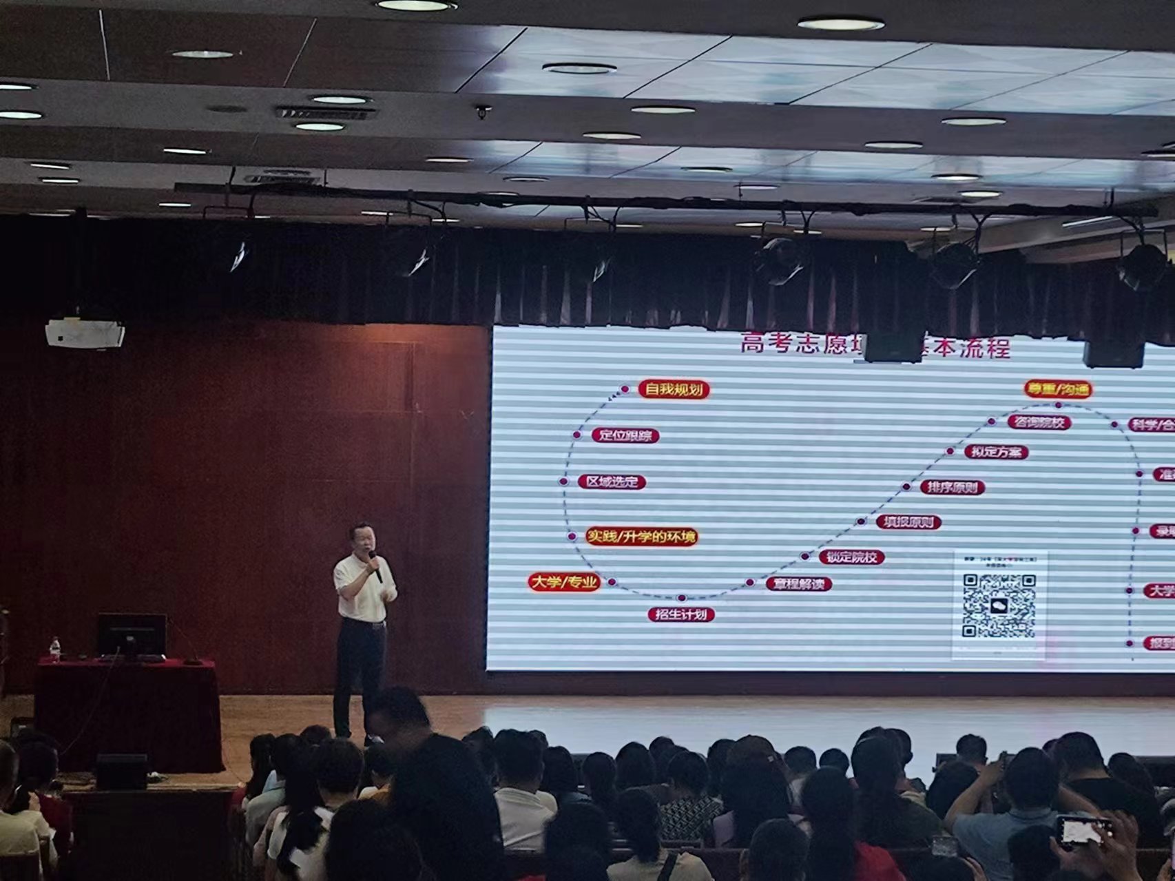 宣讲伊始,李智军书记便以“高考志愿的科学填报”为核心,展开了深入细致的讲解。李智军书记先是从高考志愿填报的宏观角度出发,梳理了整个流程的基本步骤,让在场的学生和家长对即将面临的这一重要环节有了清晰的认识。紧接着,李智军书记详细阐述了高考志愿填报的核心要点:填报志愿并非简单的选择,而是需要综合考虑多个因素,包括个人的兴趣、特长、学科优势,以及未来的职业规划等。李智军书记提醒学生们,要深入了解自己的内心需求,明确自己的发展方向,这样才能在众多的专业和学校中做出最适合自己的选择。最后,李智军书记再次强调了填报志愿的重要性,鼓励学生们要认真对待志愿的填报,做出明智的选择,为自己的未来选择一条光明的道路。