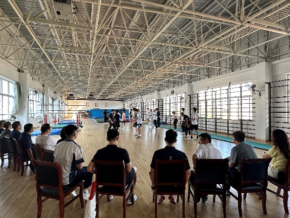 在 武汉体育学院体育教育学院党委书记孙鹏飞、国际体操学院院长魏旭波、竞技体操学校校长程菲、体操教研室主任陈永青、体操教研室书记胡磊、体操教研室秘书谢璞等领导老师 的陪同下, 深圳大学体育学院交流小组成员 走进术科教学课堂,观摩了竞技体操训练,并对《体操》《健美操》《花样跳绳》等实践类课程教学进行现场观摩和实践互动。在《花样跳绳》课上,我院花样跳绳队主教练张易老师与武汉体育学院体操教研室李健老师,就课程内容体系、教学竞赛组织和未来竞赛计划等方面进行了沟通与交流。