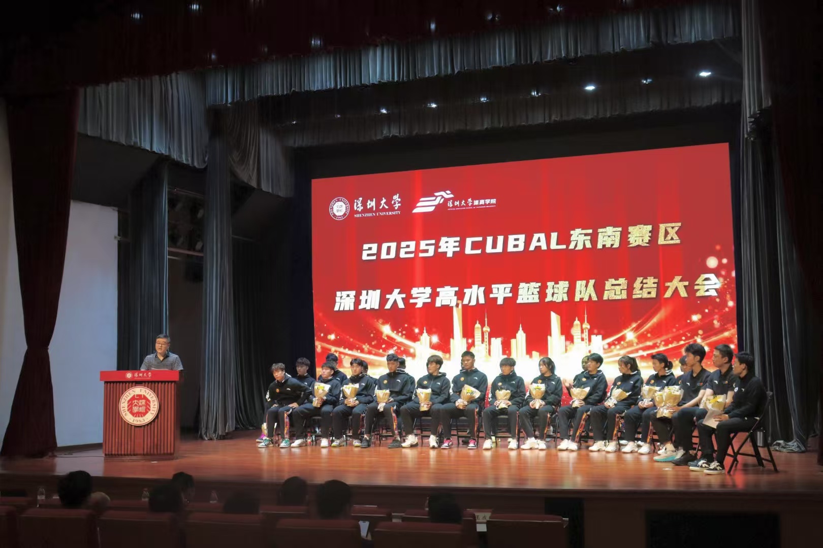 2025 年 3 月 14 日中午,体育学院于国际会议厅成功召开第 27 届中国大学生篮球一级联赛(东南赛区)高水平篮球队总结大会。此次大会由党委副书记陈方明主持,体育学院党委书记李智军、院长刘建、副院长张得保、副院长王东、副院长唐玉成以及 200 余名师生齐聚一堂,共同回溯深圳大学高水平篮球队在 CUBAL 东南赛区的高光历程。