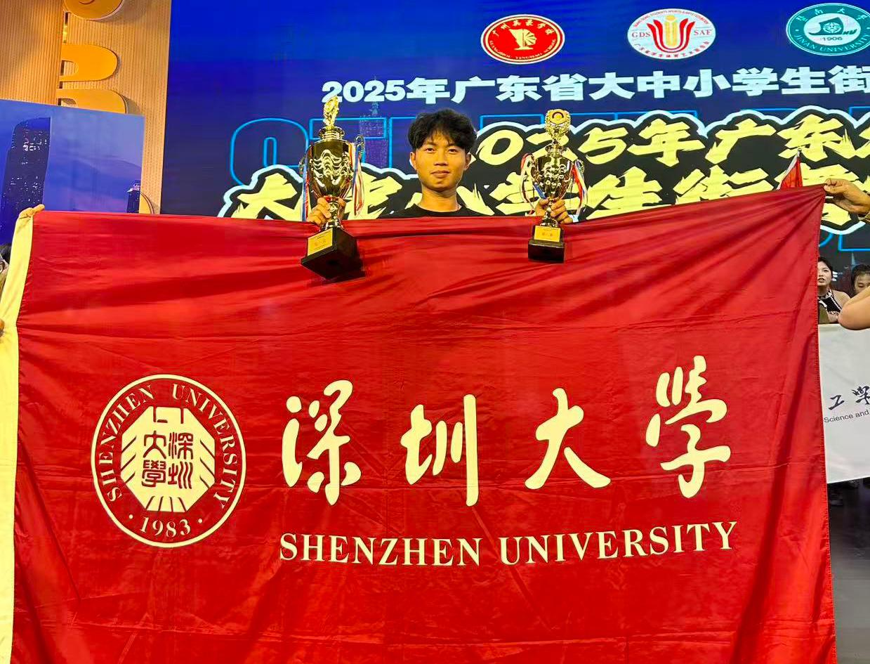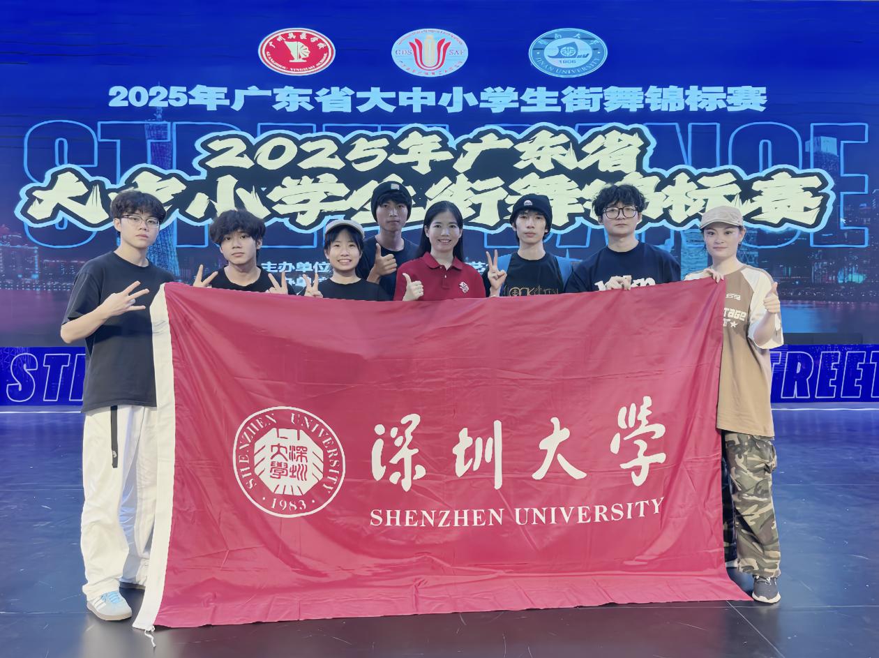 2025年5月22日至24日,由广东省学生体育艺术联合会主办、广东省学生体育艺术联合会街舞分会、暨南大学协办的广东省大学生街舞锦标赛在广州从化隆重举办。赛事共有来自全省各地近500多名学生参赛。深圳大学街舞队派出6名队员代表学校出战,经过3天紧张激烈的比拼,最终荣获1枚金牌、3枚银牌和6枚铜牌,乙组团体总分第二的优异成绩。