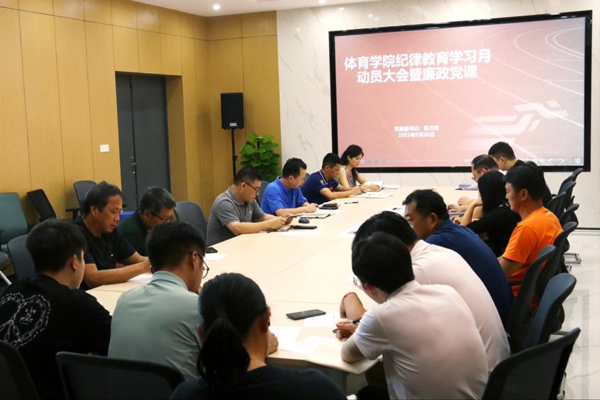 2023年9月26日上午,体育学院于元平会议室召开2023年纪律教育学习月动员大会暨廉政党课会议。学院中层以上领导干部、各支部书记、各支委参加了此次会议。