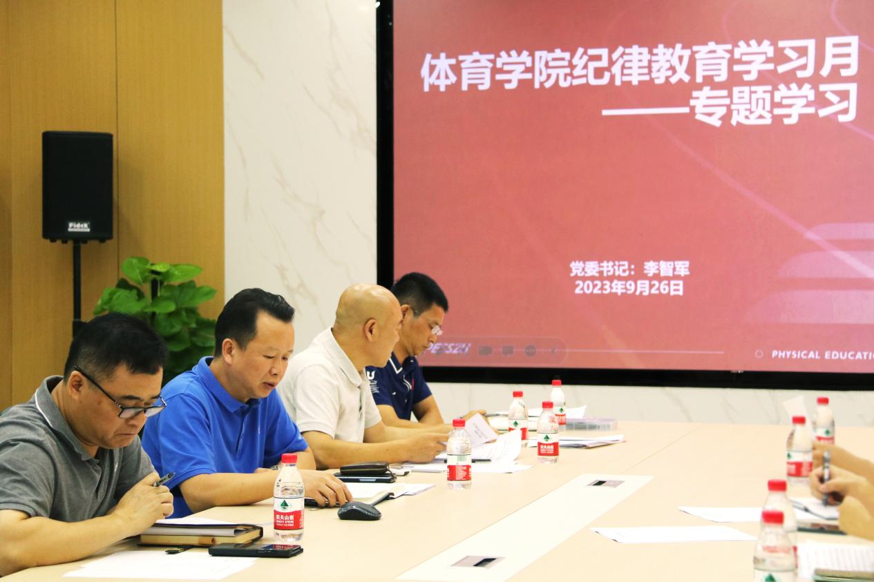 2023年9月26日上午,体育学院纪律教育学习会议于元平会议室举行,学院党委书记李智军出席,院长刘建领学第一议题,党委副书记陈方明、副院长唐玉成及学院全体中层以上领导、全体教工党员到场参会。
