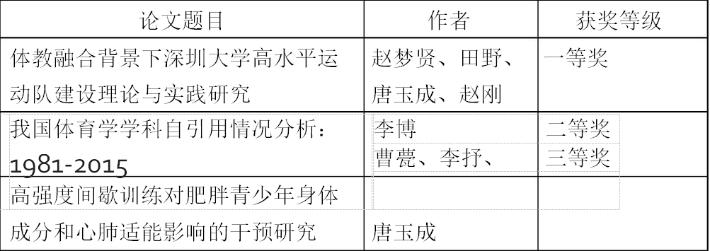 ꢀꢀ根据省教育厅《关于对广东省第十一届大学生运动会科学论文报告会论文评审结果的公示》,本届科报会共收到广东省各高校报送的论文873篇。经专家评审、查重和评审委员会确认,我院报送的三篇论文分获本届科学论文报告会论文一等奖、二等奖和三等奖。