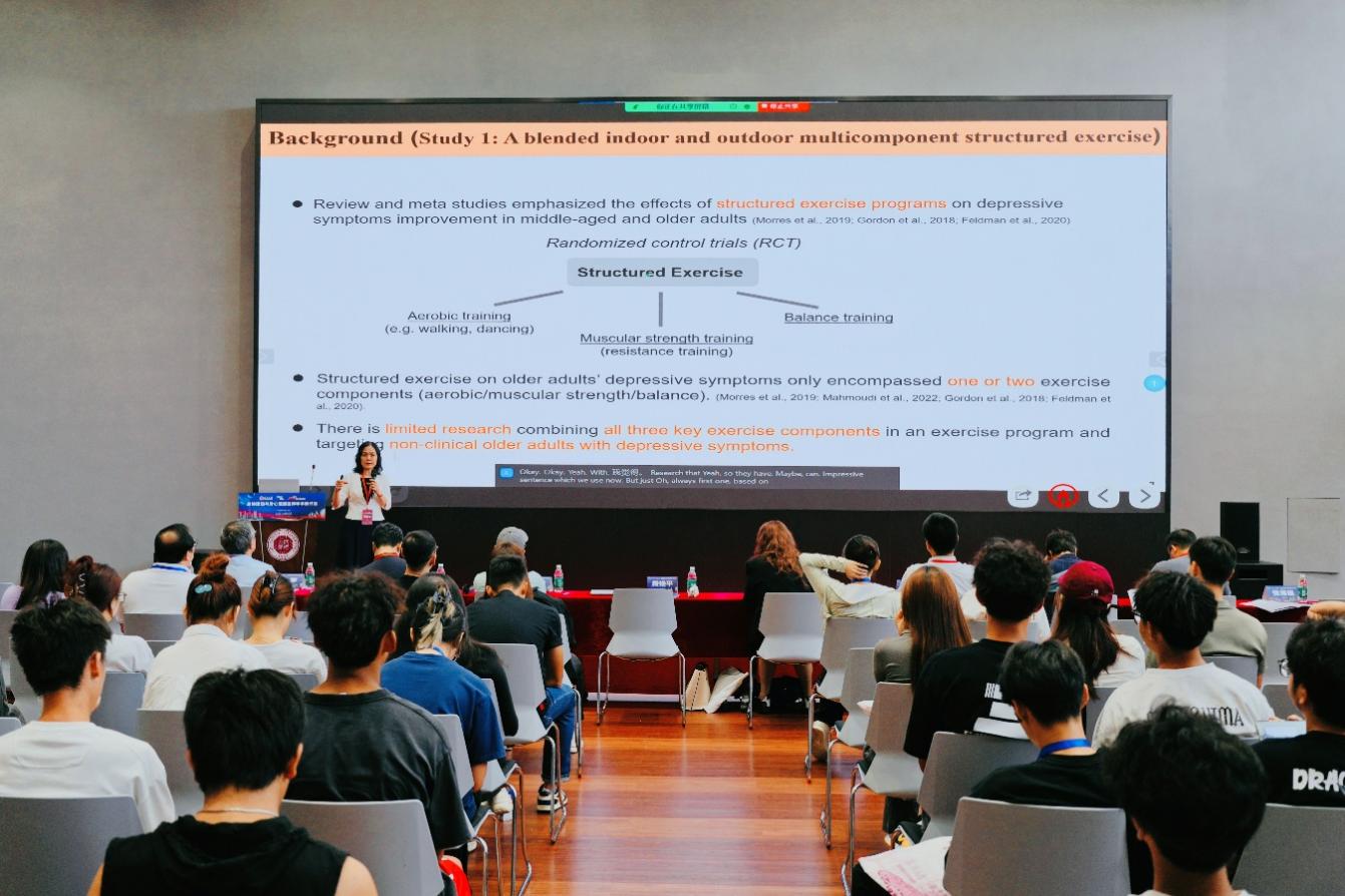 研讨会报告日上午的三场报告由香港浸会大学段艳平教授和深圳大学体育学院苏宁博士主持。备受关注的首场报告来自ASPA亚洲委员会主席、香港浸会大学体育、运动与健康学系的段艳平教授。她以“Effects of innovative physical exercise modalities on depressive symptoms in Hong Kong older adults: findings from two randomized controlled trials”为主题,深入探讨了高强度间歇运动及室内室外相结合的多模态运动干预对于老年人抑郁患者的影响及机制。段教授的分享为与会者提供了关于创新体育锻炼方式在改善老年人抑郁症状方面的宝贵数据,也为未来的研究和实践提供了有价值的参考。