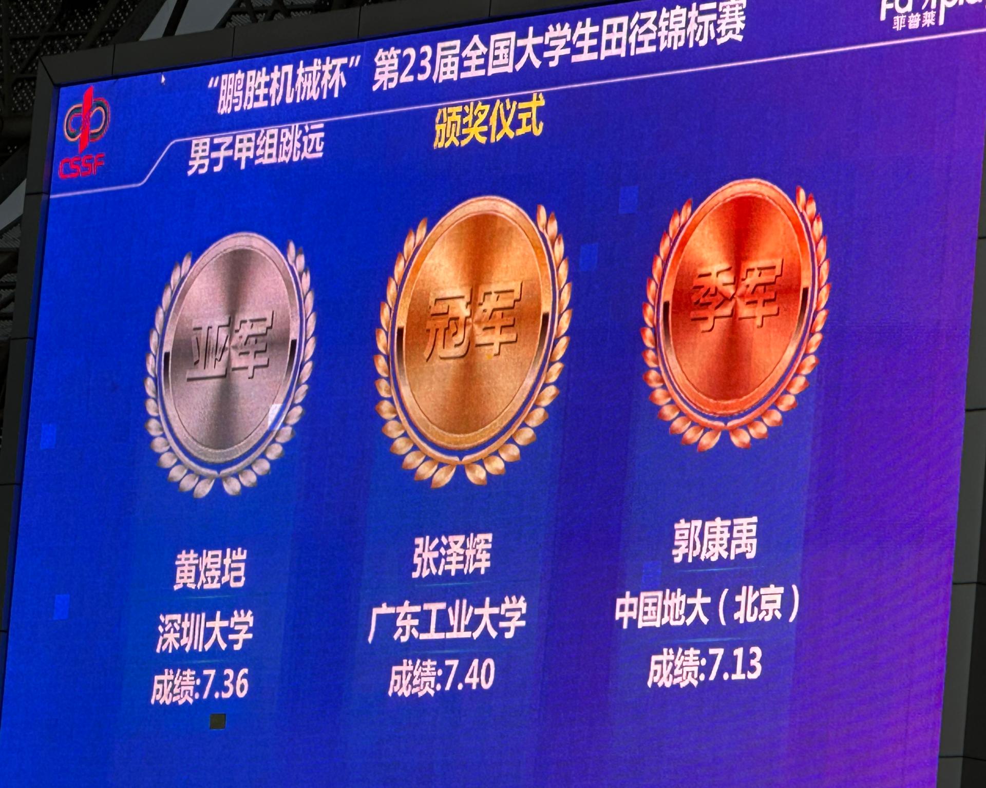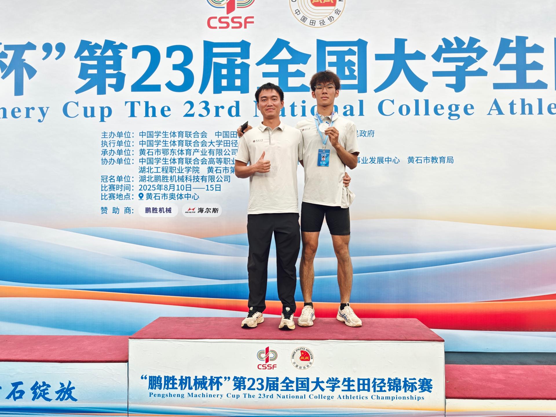我校土木与交通工程学院的黄煜垲同学在甲组(普通本科大学生组)跳远比赛中,以 7.36 米的优异成绩创造了个人最好成绩夺得银牌,并成功达标一级运动员标准。甲组作为非专业体育生的竞技舞台,黄煜垲以坚韧毅力和刻苦训练,在高水平赛事中斩获佳绩、为校争光,展现了普通大学生的风采。