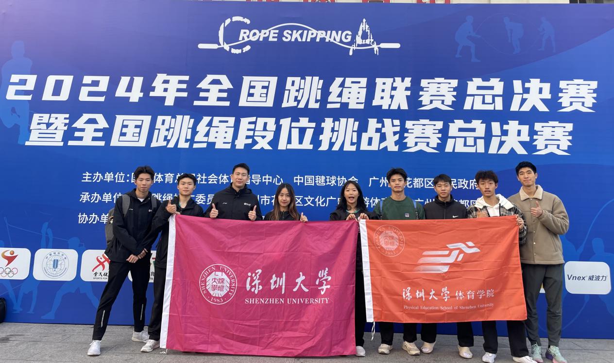 由国家体育总局社会体育指导中心、中国毽球协会、广州市花都区人民政府主办、全国跳绳推广委员会、广州市花都区文化广电旅游体育局、广州市花都区教育局承办、上海大健石体育文化传播有限公司协办的2024年全国跳绳联赛总决赛于12月28日至31日在广州市花都区花都体育馆举行。深圳大学代表队共派出休闲体育旅游和高尔夫专业的13名同学参赛。经过4天的激烈角逐,在来自全国24个省(自治区、直辖市)150余支队伍近千名运动员的比赛中,共夺得1枚金牌、3枚银牌、6枚铜牌、2项第四名、2项第五名、1项第六名的好成绩,教练员张易老师获得“优秀教练员”称号。