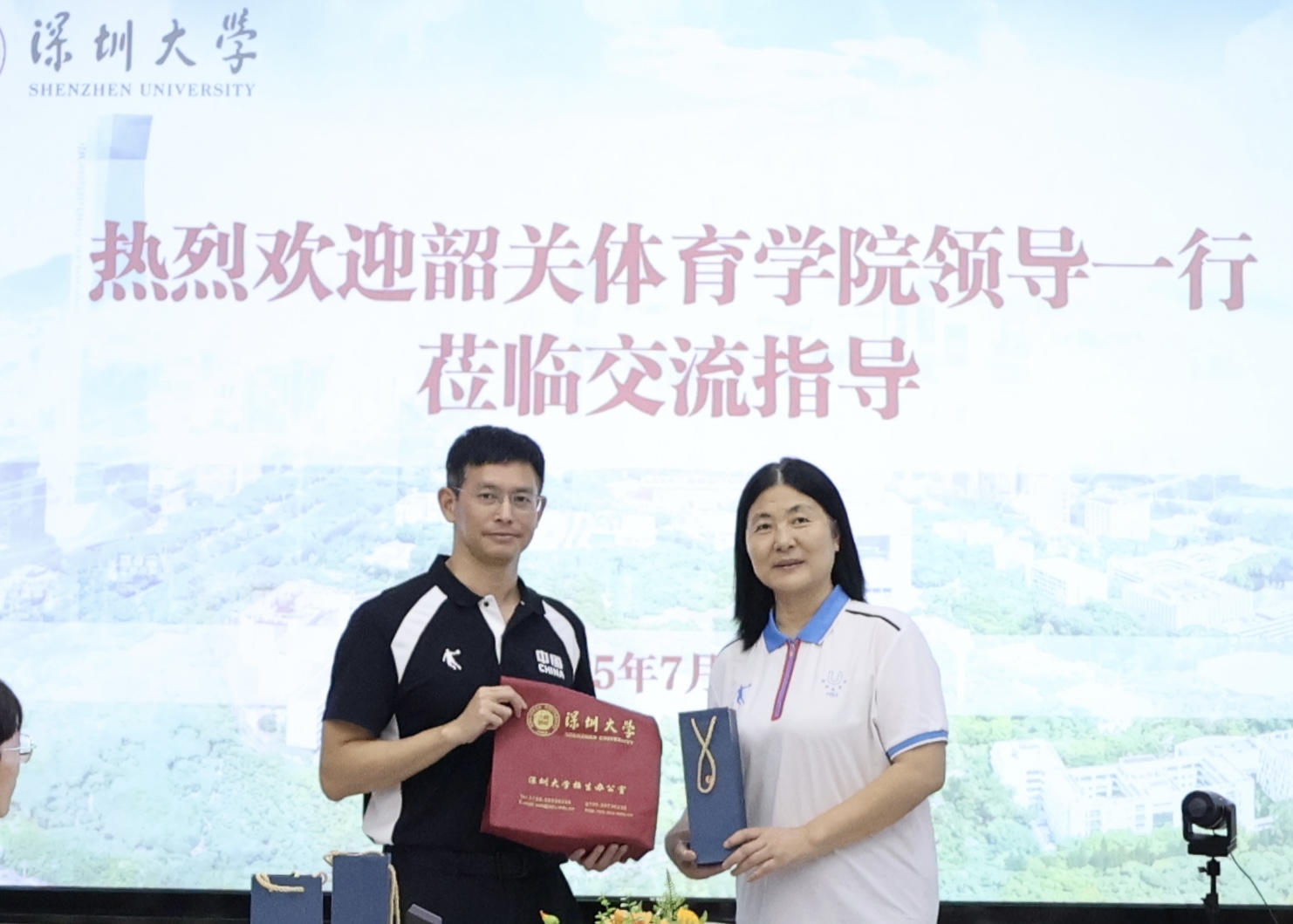 在交流会尾声,深圳大学体育学院副院长唐玉成向韶关学院体育学院赠送深圳大学纪念品,以表达双方深厚情谊和美好祝愿。
